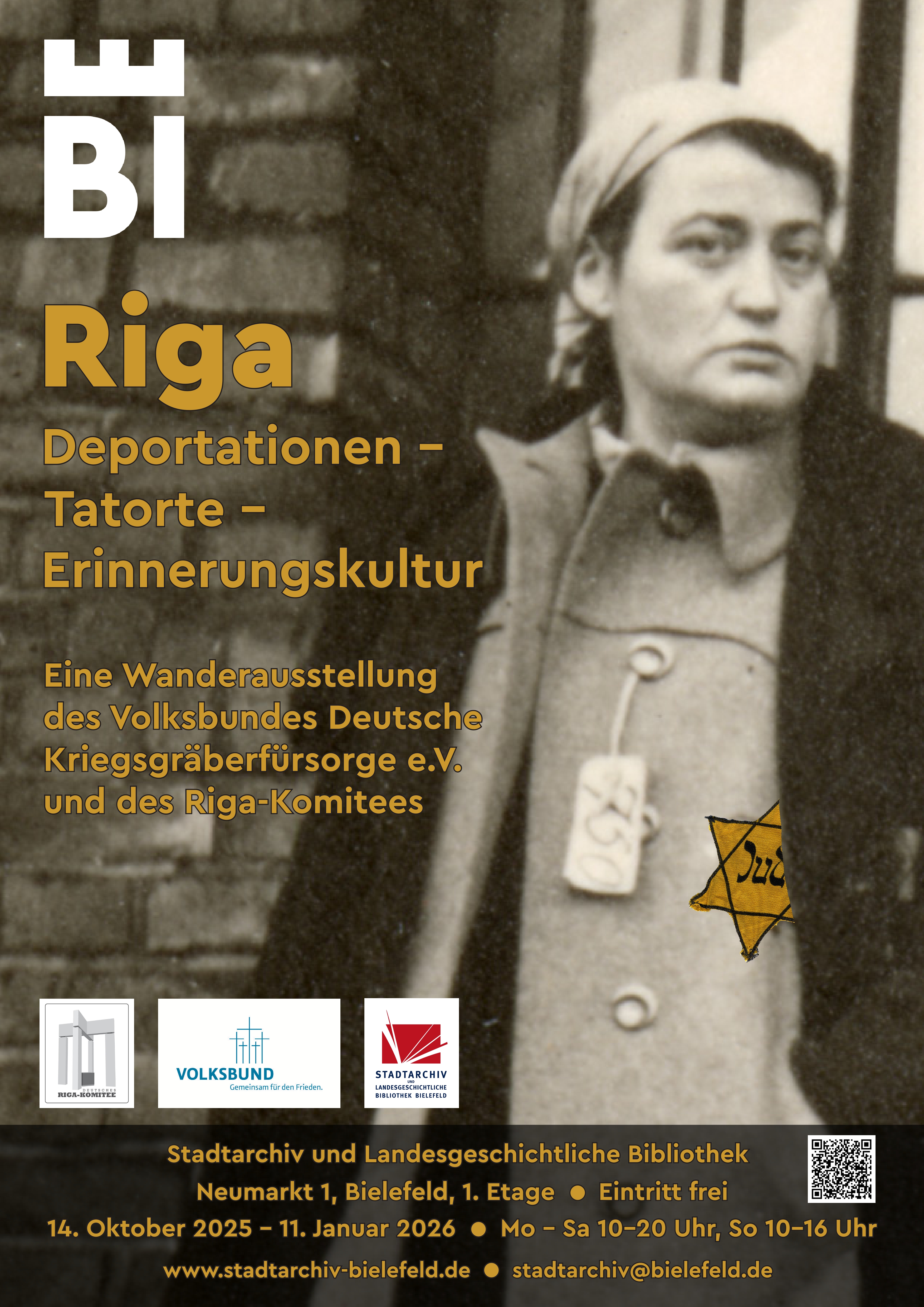 Am 13. Oktober 2025 um 18 Uhr wird im Stadtarchiv Bielefeld die Wanderausstellung "Riga. Deportationen – Tatorte – Erinnerungskultur.“ in Anwesenheit der Regierungspräsidentin Anna Katharina Bölling, Vorsitzende des Bezirksverbands Ostwestfalen-Lippe im Volksbund, sowie des Oberbürgermeisters